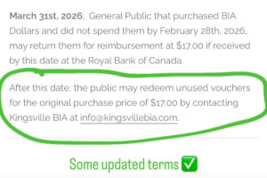 The terms have since been updated on their website with “After this date, the public may redeem unused vouchers for the original purchase price of $17.00 by contacting Kingsville BIA at info@kingsvillebia.com.”
